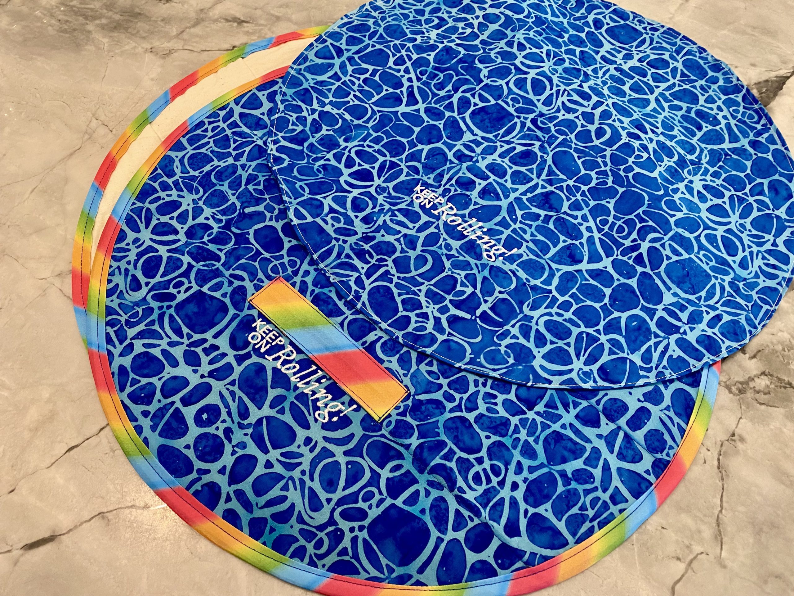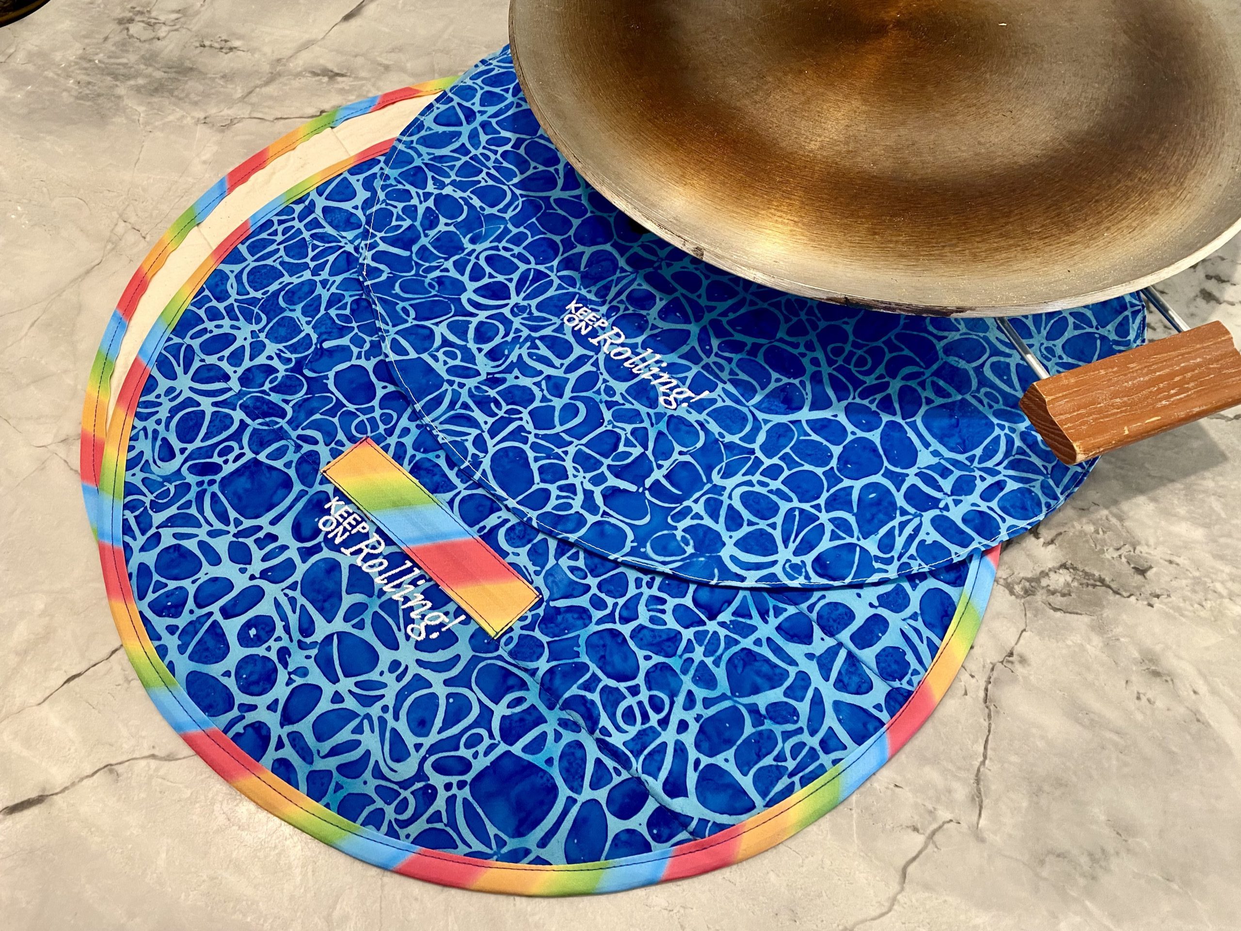 Now we’re talking! With the Cozy-Pro Combo—Over the Rainbow, you get your lefse rounds cooling to tender temptation inside this gorgeous blue lefse cozy with the white embroidery and the rainbow trim. The fabric calls to mind unearthing a treasure trove of sapphires—which is almost as exciting as making a good batch of lefse! You also make lefse safely with the matching counter protector that fits under your lefse grill and keeps big-time heat away from your beautiful—but-breakable counter. Safety and style—that’s the Cozy-Pro Combo—Over the Rainbow!
