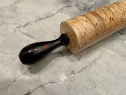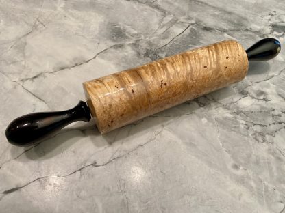 Sometimes you can’t make a magnificent piece of flashy maple burl even more breathtaking than it is … so you don’t bother. Sand it smooth, add a shiny finish, and attach rich, blackwood handles. This pin will be the first picked up and oohed over at markets. A steel rod runs through the barrel of the pin into each handle, and bearings at each end of the barrel ensure a smooth roll. Truly the Maple Burl Brilliance rolling pin is a functional piece of art that you use and proudly display. Made by me, Gary Legwold of the Minnesota Woodturning Association.