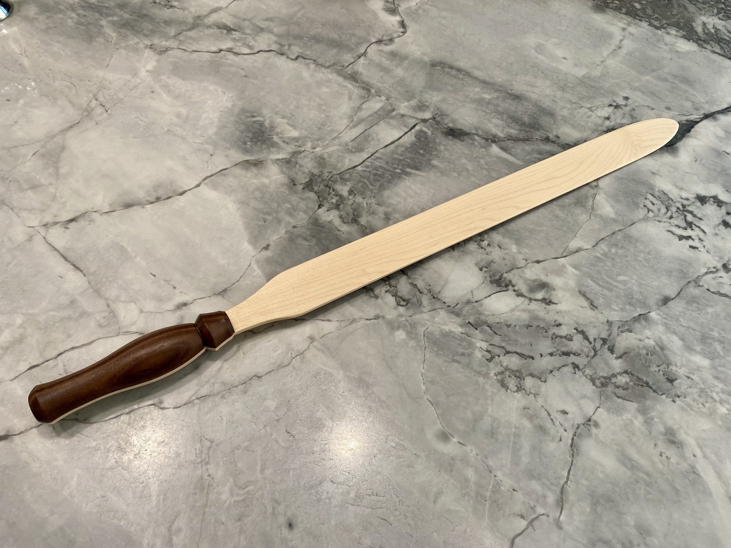 There are lefse turning sticks, and then there is this magnificent, made-for-serious-lefse-makers tool with a ergonomic handle. The distinctive thumb ridge of the walnut handle is great for control, and the Walnut Thumbelina feels so good you may not want to put it down. The maple blade with the beveled front edge is firm, flexible, and fantastic for flipping rounds. The quality, feel, and functionality are uniformly excellent. Crafted by Jim Jacobs of the Minnesota Woodturners Association.